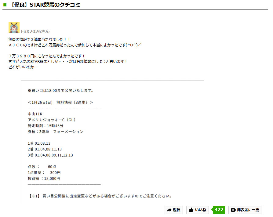 ぜひこちらから【STAR競馬】の口コミページへ飛ぶことができますので、ご登録へ進んでください。