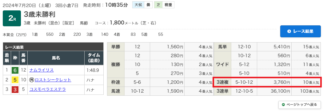 7月20日・小倉11レース テレQ杯 3歳3勝クラス 芝2000m
