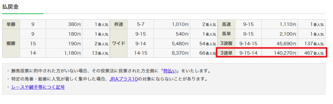 しかし、3連単10点という必要最低限の買い目点数、1点500円のワンコイン馬券術で見事10万馬券を的中に導いた。