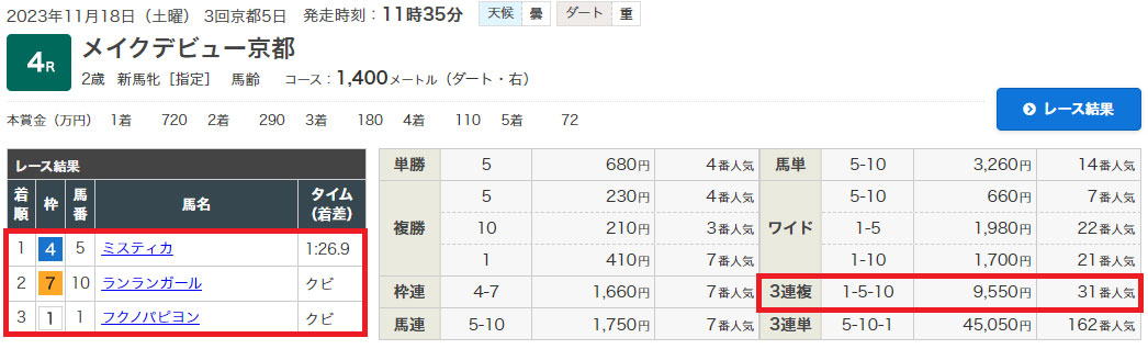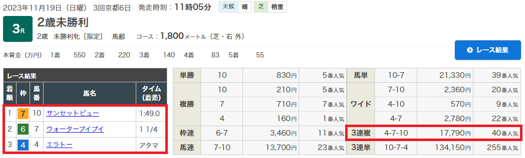 ⑤⑩は馬券内にきましたが、7番人気①は切っていたので的中ならず。