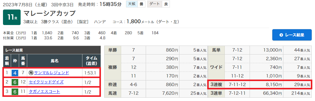 8日(土)中京11Rで3連複81.5倍的中!
