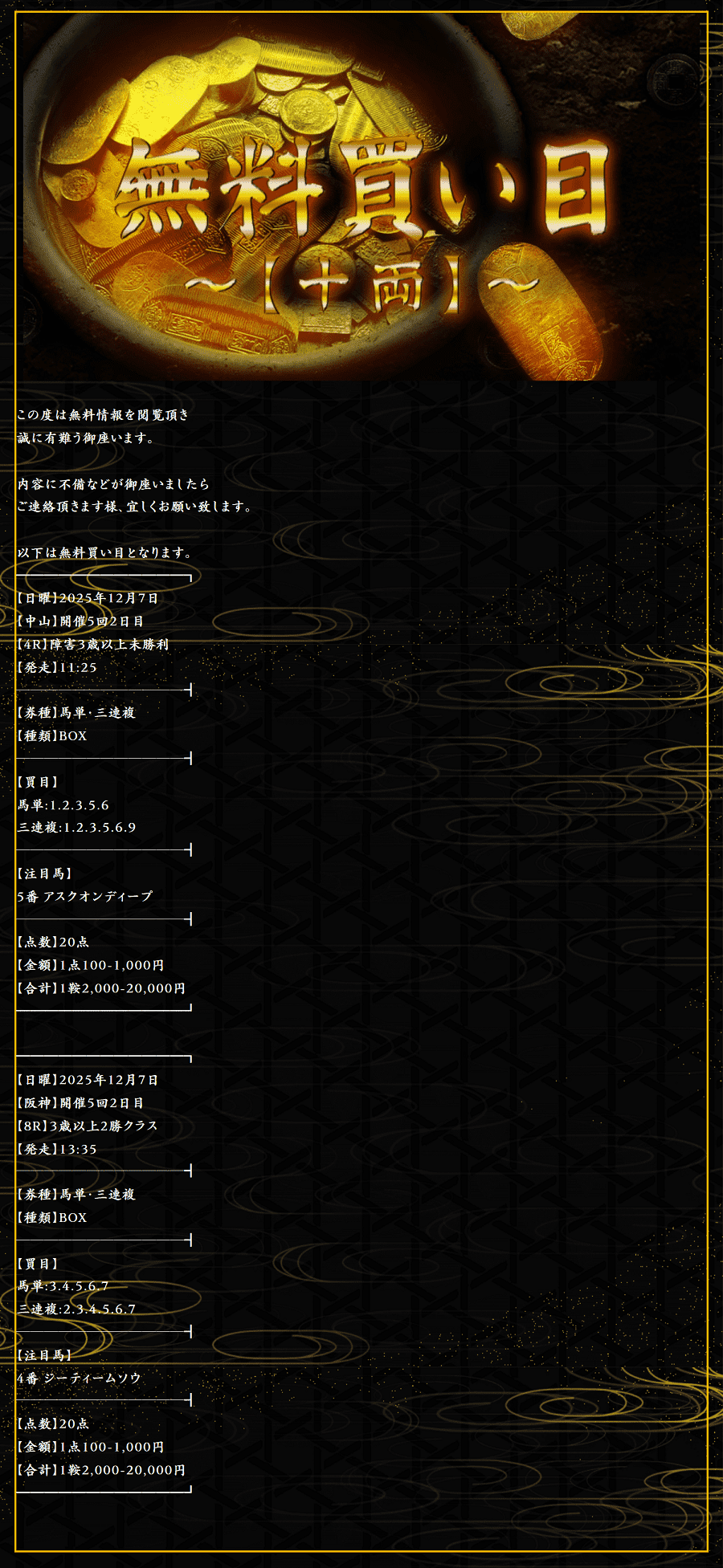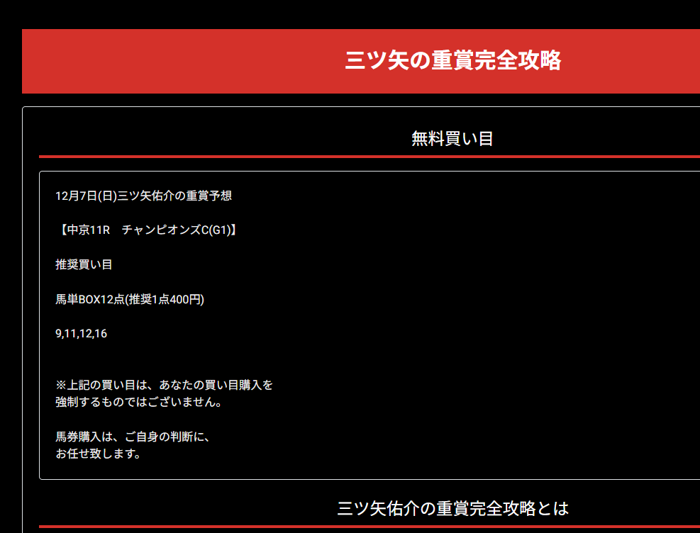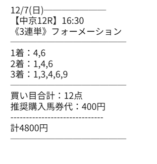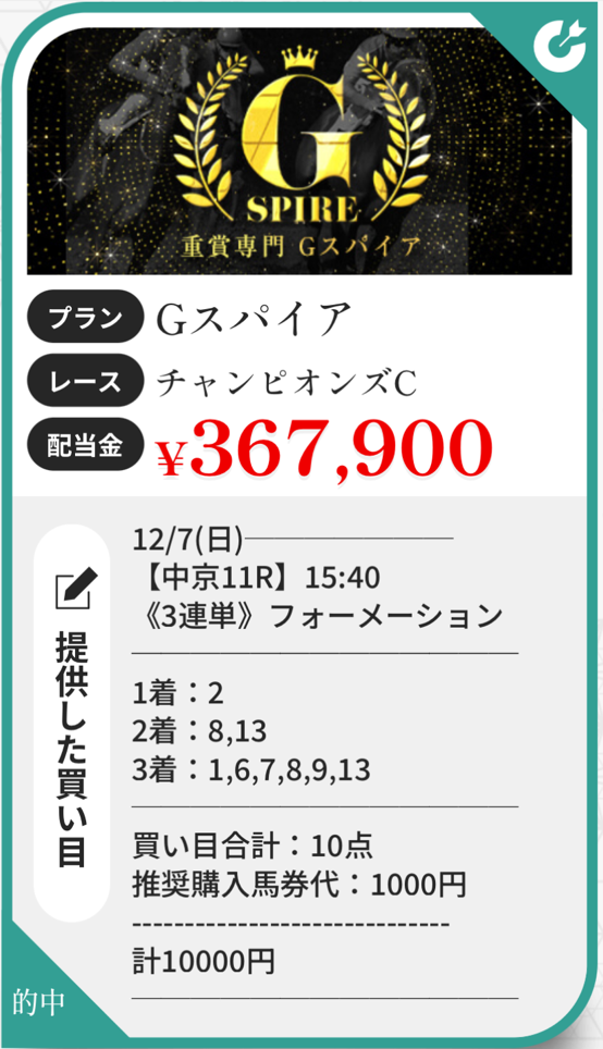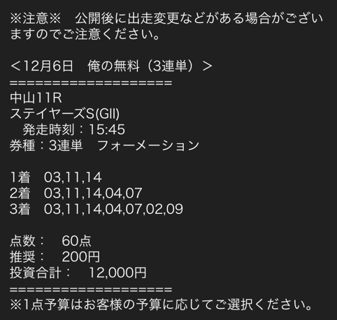 管理人さんが試されていたスタートダッシュプラン使ってみました。 推定配当30~50万でどんな結果になるか楽しみな週でした、結果は 3発3的中で38万1250円払戻し。 情報参加費用9,800円。 3鞍馬券代29,000円。 回収率→982% 情報料+馬券代を差し引いても→+34万2450円収支。 画像が1枚しか張れなかったので重賞の買い目だけを貼っておきます。 12/6土曜日 阪神10R妙見山ステークス/130,950円 12/7日曜日 阪神11Rりんくうステークス/119,350円 G1チャンピオンズカップ/130,950円
