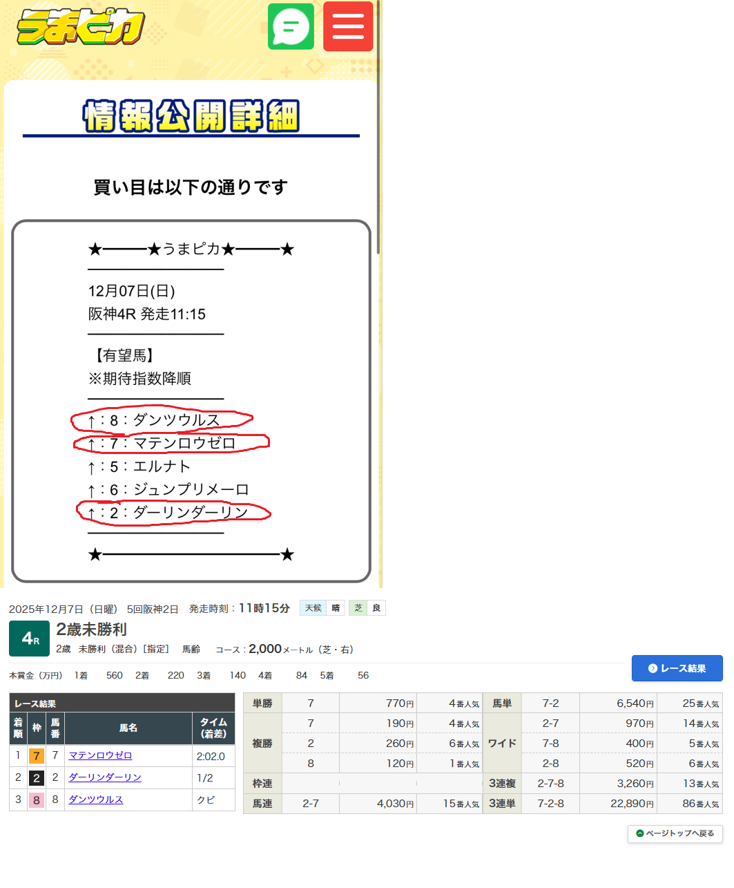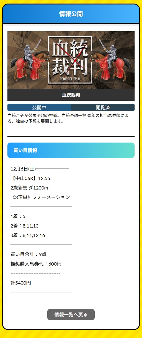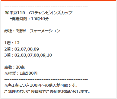 めっちゃ当たってる口コミ見たから使ってみたら初日から中山1Rで6万8700円の払い戻し! チャンピオンズカップはナルカミ大本命で負けちゃったけど、この的中のおかげで何とかプラス収支で乗り越えました! 自分の予想が下手過ぎて泣けてきます(笑)