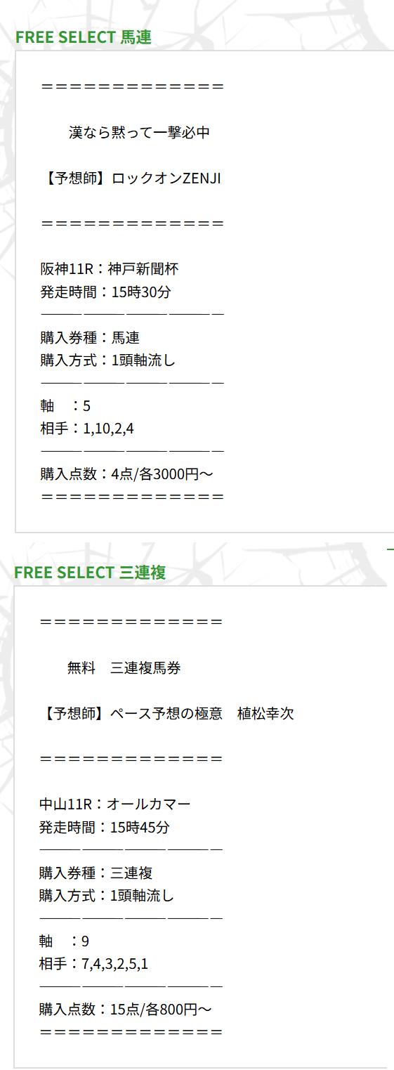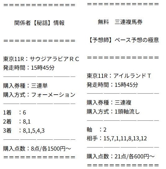 素人なりに画像編集してみました、日曜日の2鞍分の無料情報公開買い目になります。 無料情報だったので3連単買い目ではなかったですが両レースとも当たっていました。 比較的硬い決着だったけど東西重賞ダブル的中はまぐれでは不可能。 個人的にはサイト内の重要関係者情報、『ガチ馬』投票権が気になっております。 様子見て利用してみようと思います。無料情報より精度の高い配当が魅力的。